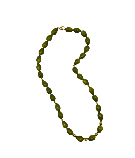 Collar de bolas en forma y color verde oliva combinado con piezas doradas de acero inoxidable.